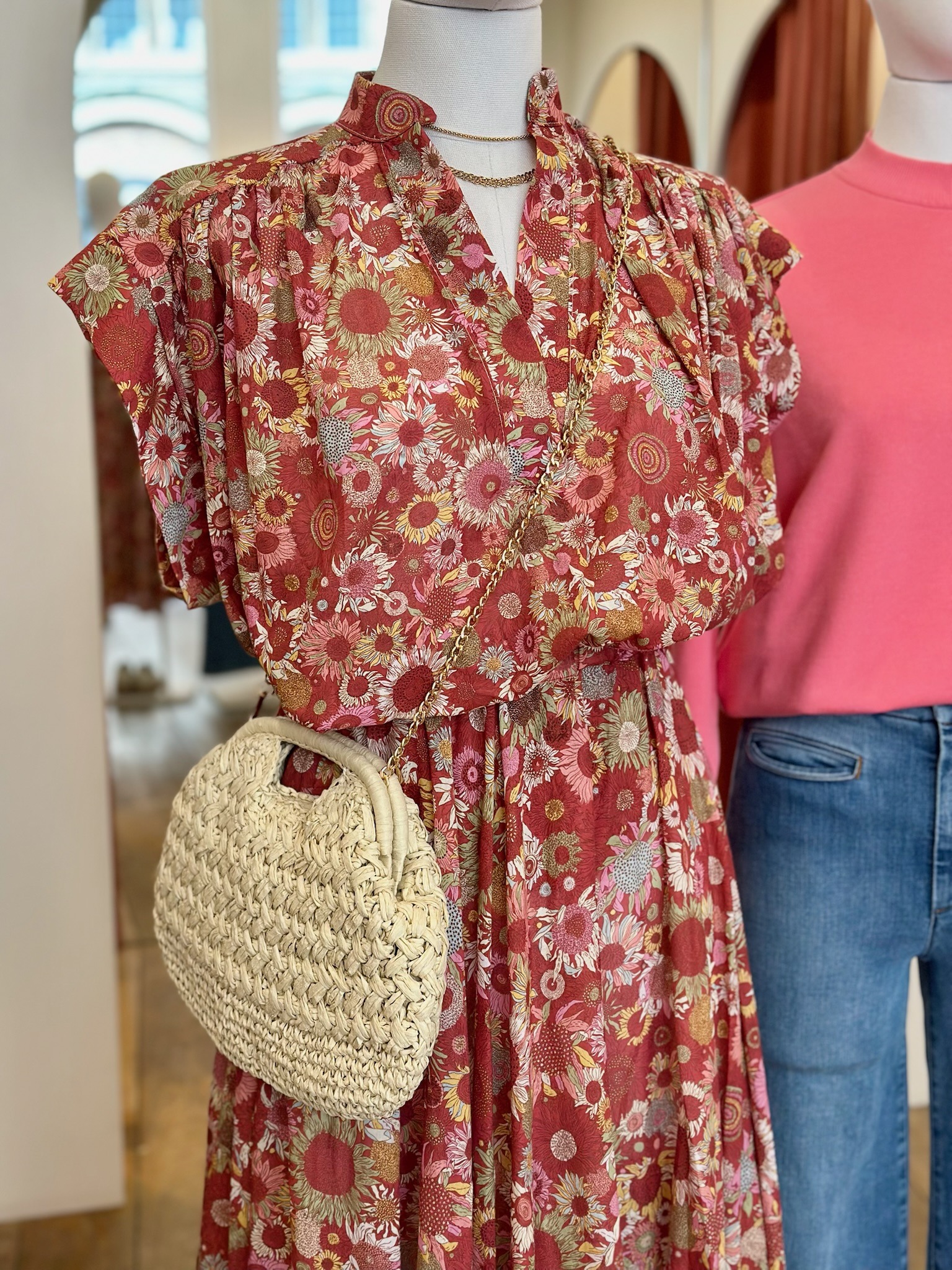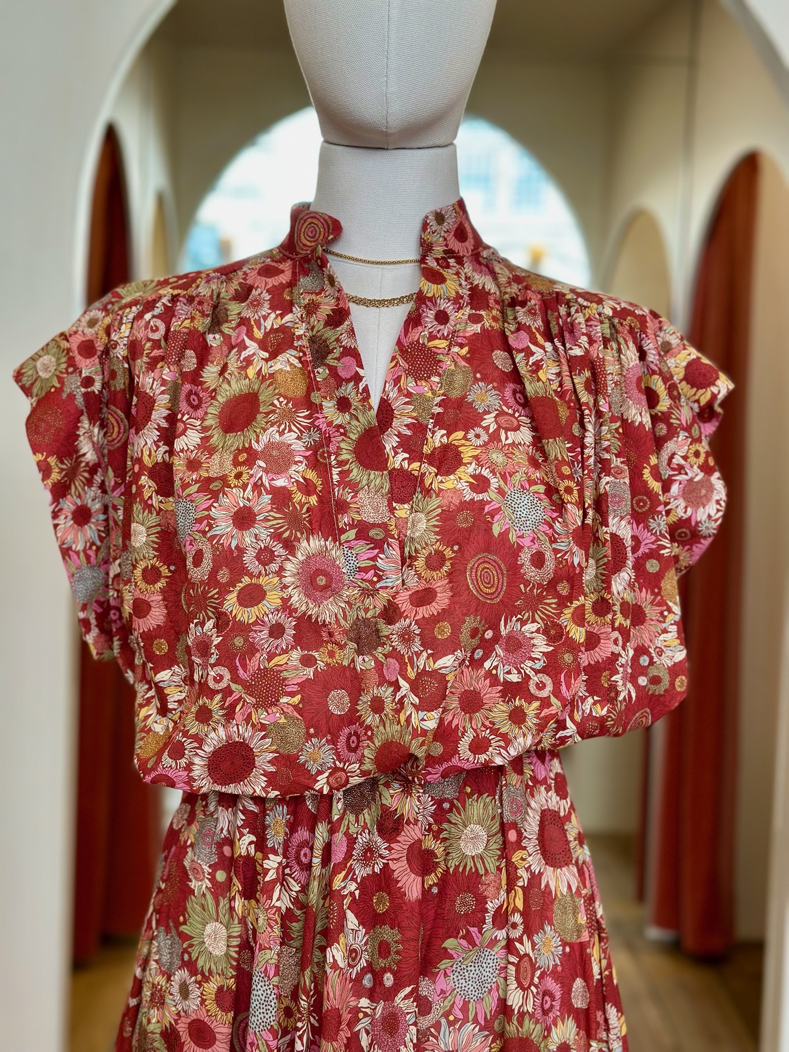 Blouse Perla à motifs fleuris et manches courtes dans les tons rouges, dorés et verts. Son encolure légèrement ouverte et sa coupe ample apportent légèreté et confort, tout en restant élégante.