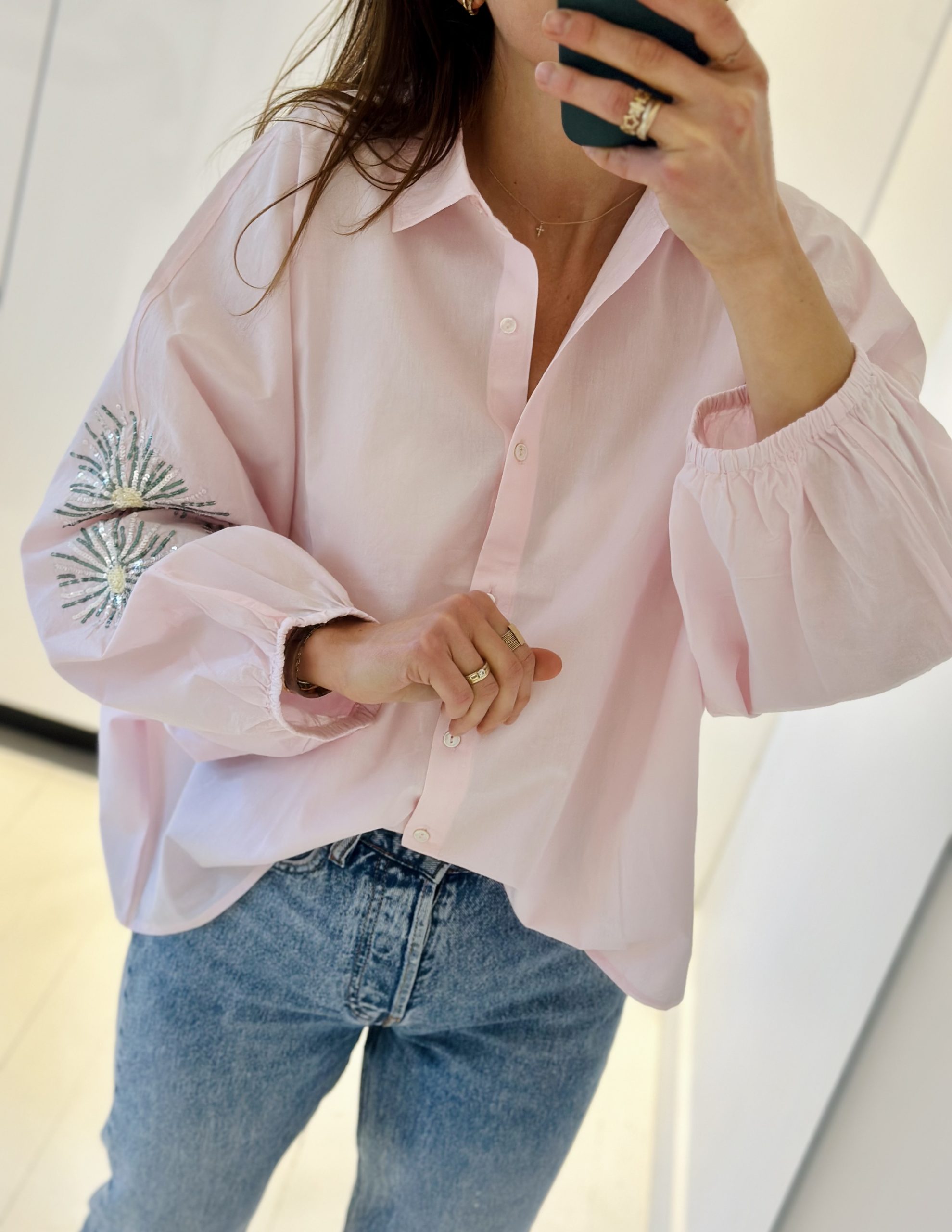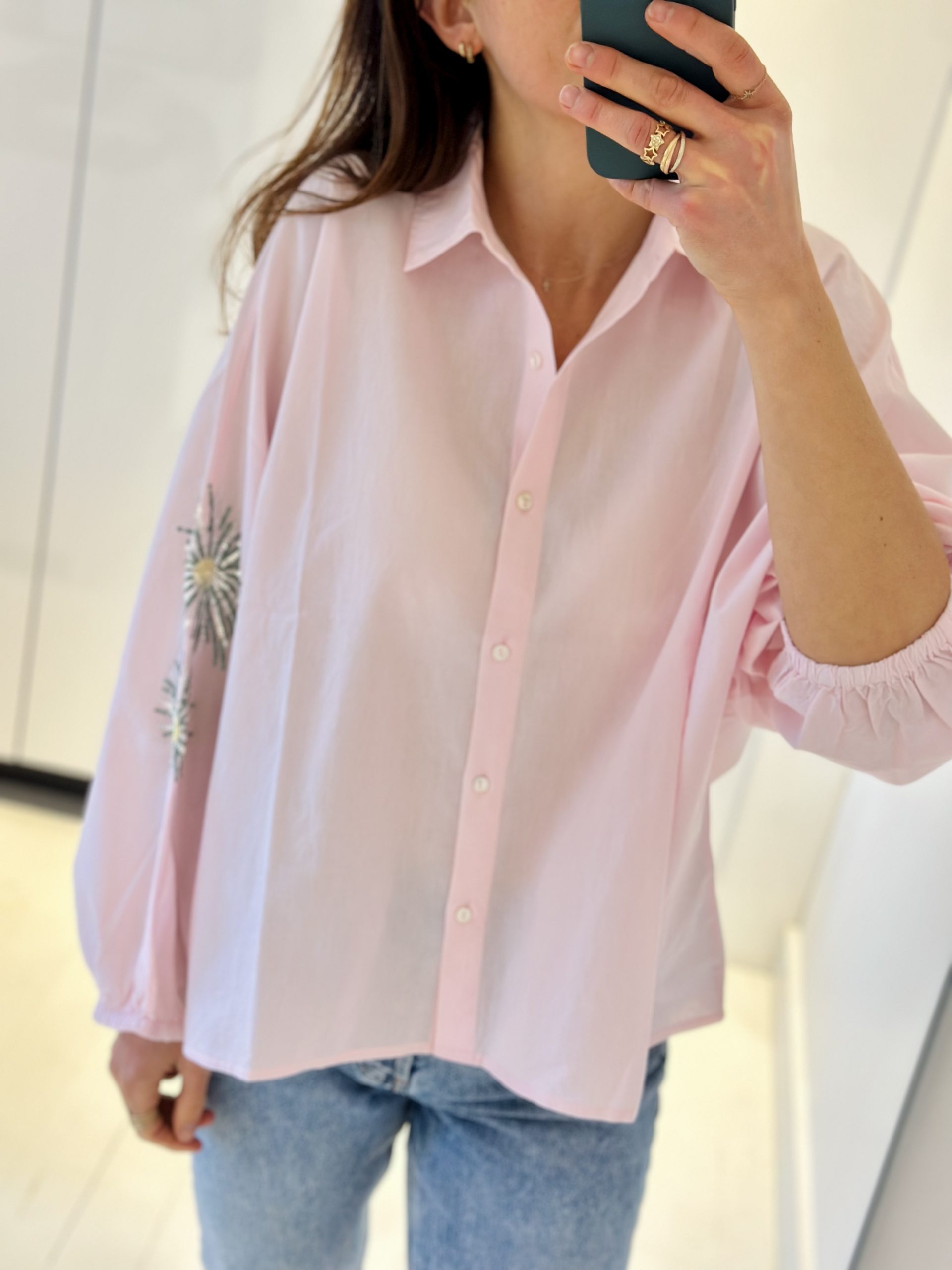 Blouse Saba rose poudré, rehaussée de broderies florales à sequins sur les manches pour une touche lumineuse. Son col chemise classique et sa boutonnière apportent une allure élégante, tandis que ses manches longues bouffantes offrent un joli volume. Couple large et légèrement plus longue à l’arrière.