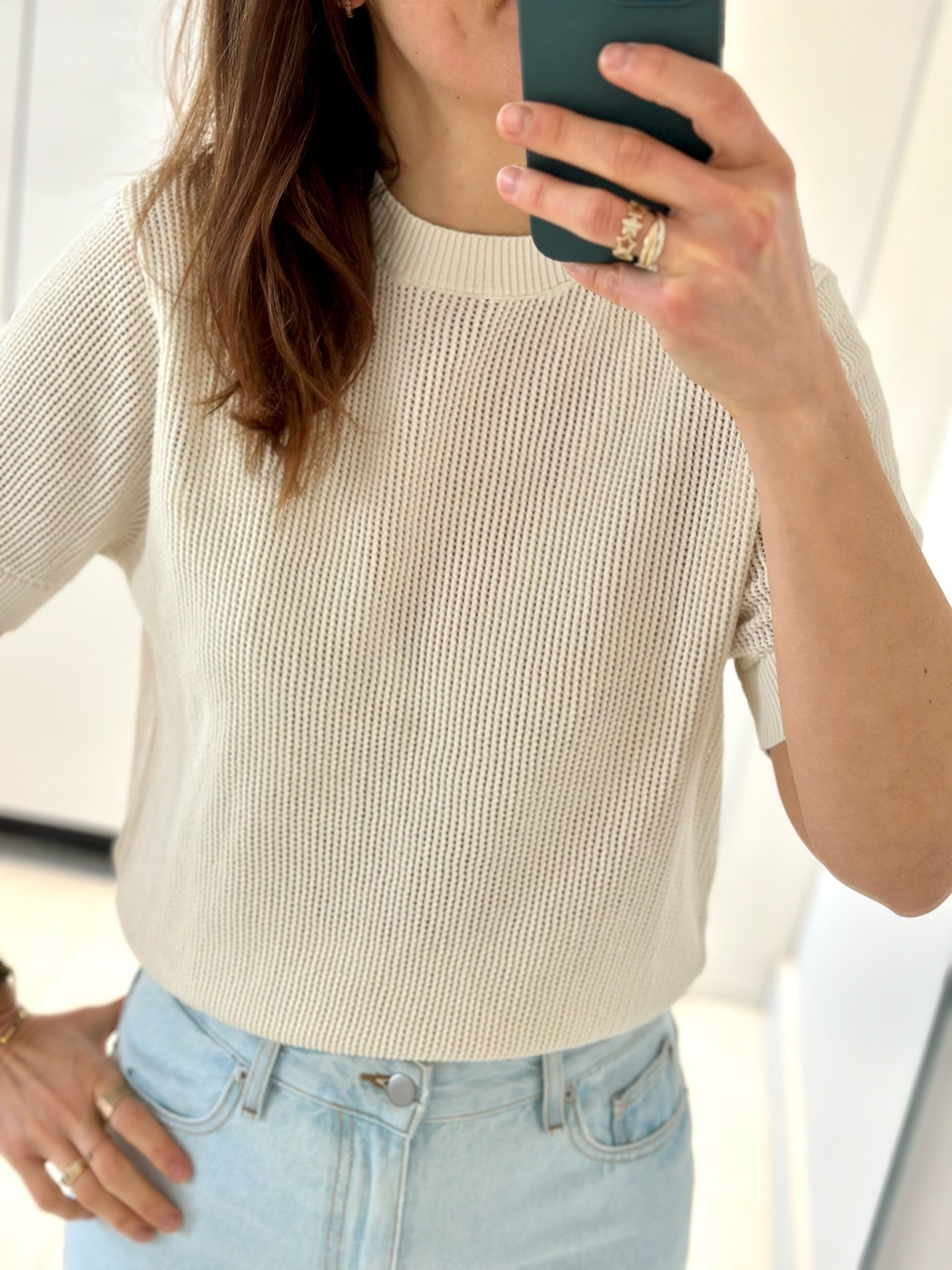 T-shirt Vima Écru dans une texture subtilement ajourée qui apporte relief et légèreté. Son col rond lui donne une allure simple et intemporelle. Doté de manches courtes et d’une coupe légèrement ajustée, il offre un tombé confortable et féminin. Une pièce facile à accorder au quotidien.